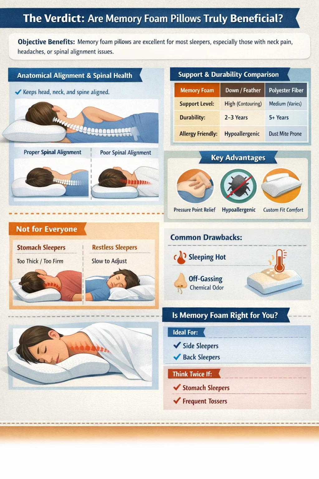 Embora ofereçam vantagens ortopédicas significativas, não são uma panacéia universal. Sua “bondade” depende muito de sua postura pessoal ao dormir, tolerância ao calor e sensibilidade aos odores materiais. Para quem dorme de lado ou de costas, um travesseiro de espuma viscoelástica pode ser uma opção ferramenta transformadora para higiene do sono , enquanto quem dorme no estômago pode considerá-los muito restritivos ou firmes.