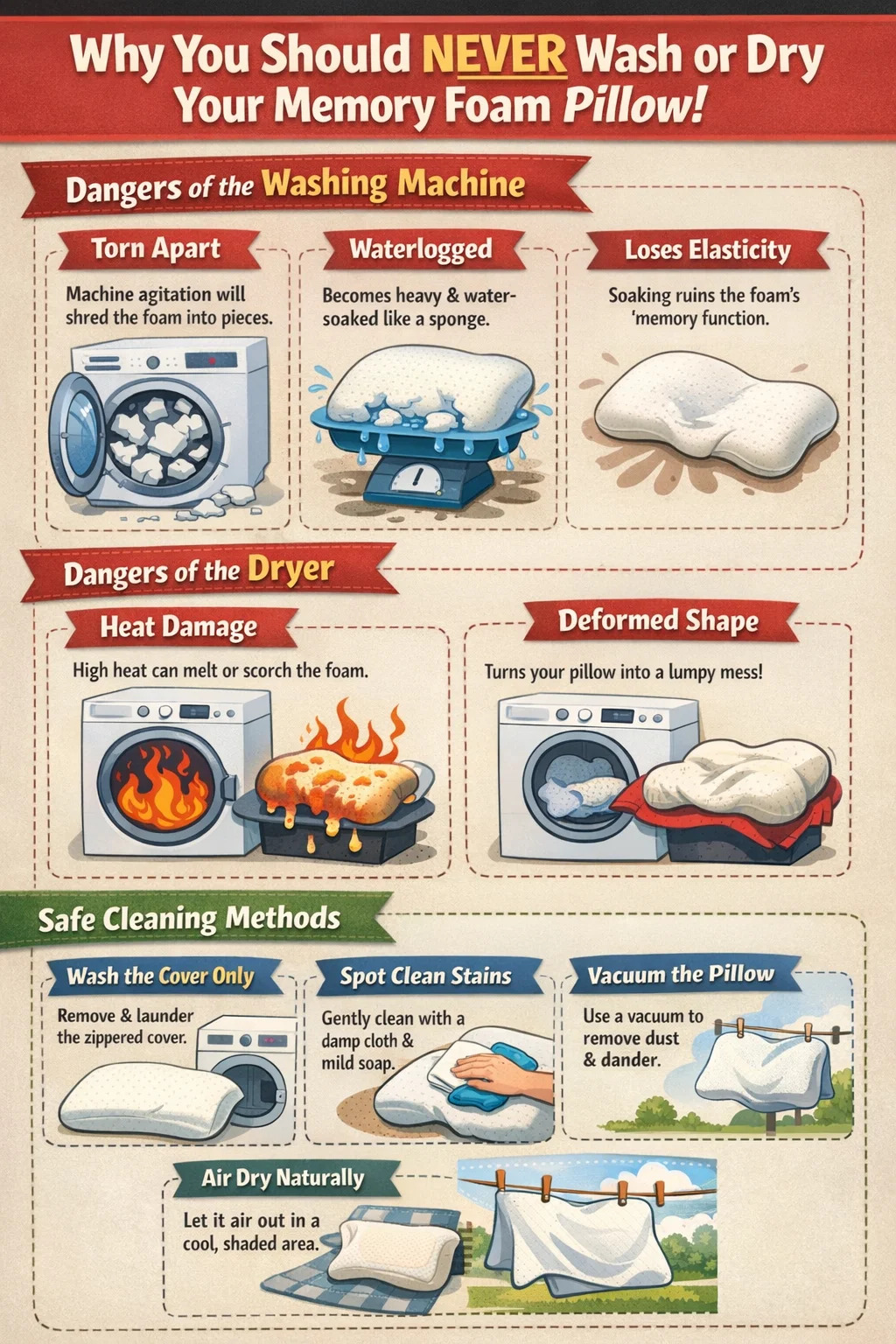 Most memory foam pillows have a zippered cover. Basta retirar a capa e lavar essa camada na máquina de lavar. Limpeza localizada: Se você acidentalmente derramar café ou manchar o travesseiro, use um pano umedecido com um pouco de água morna e sabão para limpar suavemente a mancha. Do not soak the entire pillow.