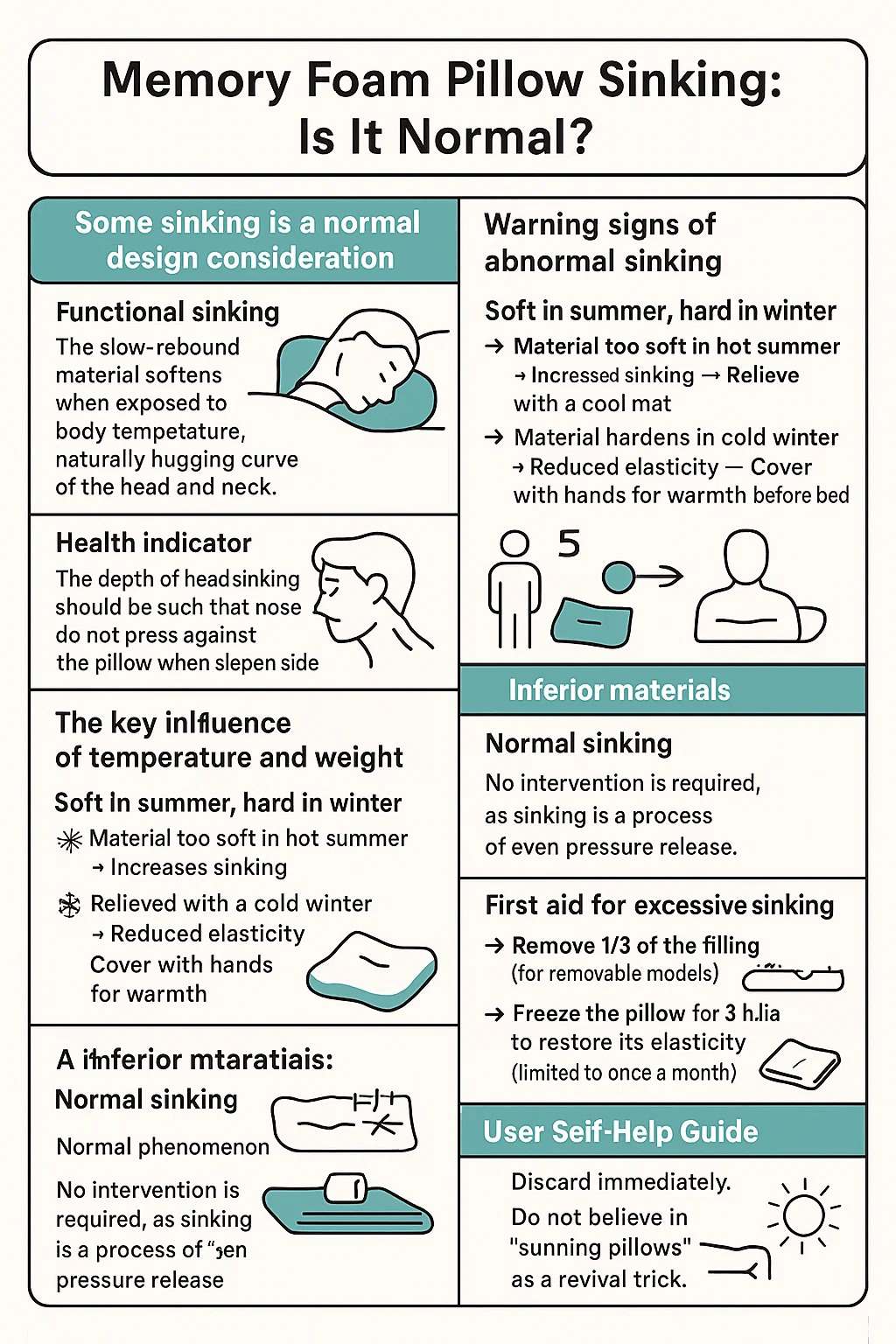 Primeiros socorros para afundamento excessivo: → Remova 1/3 do recheio (para modelos removíveis) → Coloque uma toalha dobrada sob a fronha para suporte temporário → Congele o travesseiro por três horas para restaurar sua elasticidade (limitada a uma vez por mês).