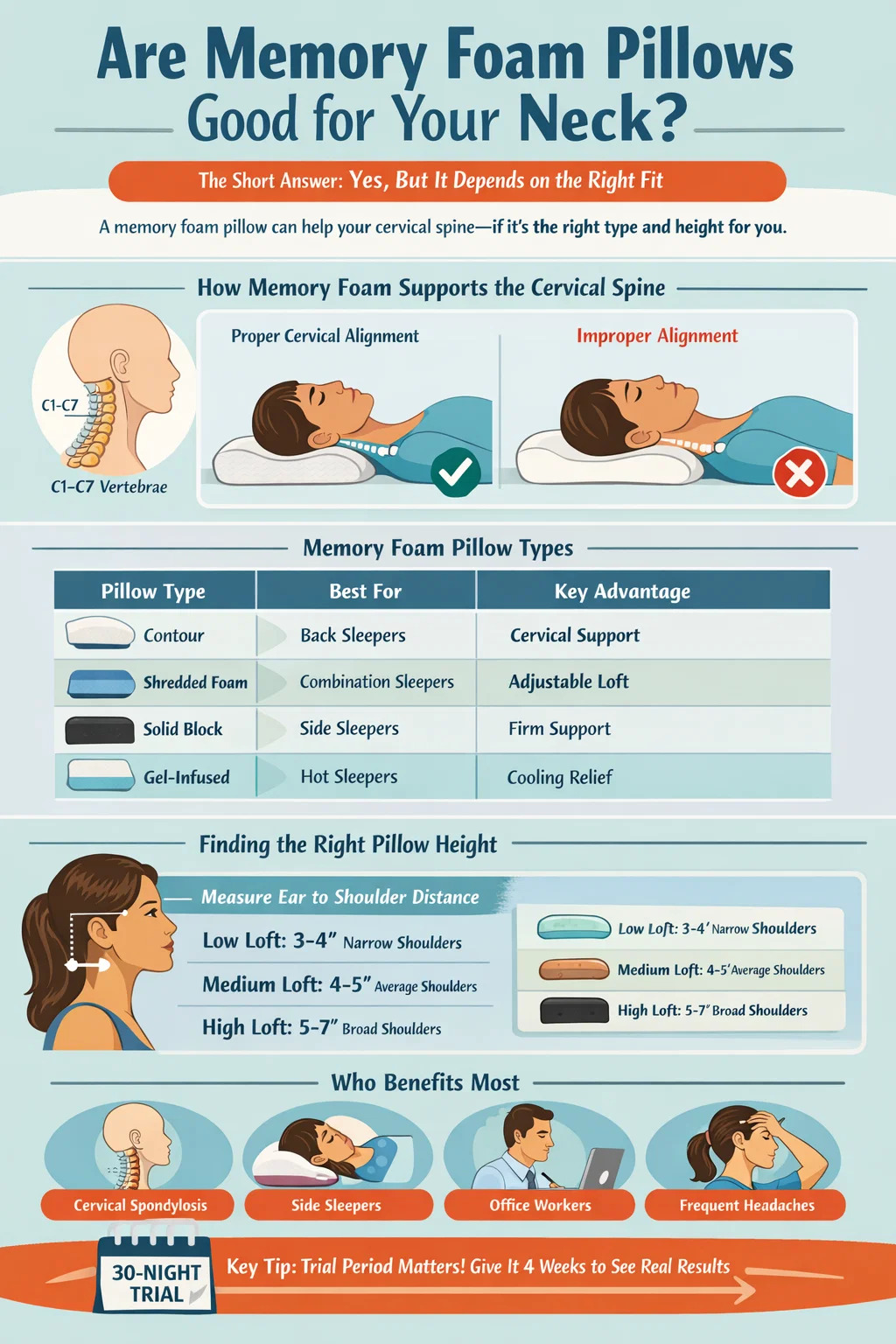 Para a maioria das pessoas que lidam com desconforto cervical geral, um travesseiro de espuma viscoelástica contorno com zonas de loft duplo (uma crista superior, uma crista inferior) oferece o suporte mais versátil. O lado superior acomoda dormir de lado, enquanto o lado inferior funciona para dormir de costas. Este design reflete diretamente as recomendações frequentemente dadas por fisioterapeutas para dores de cabeça cervicogênicas e tensão do trapézio superior.