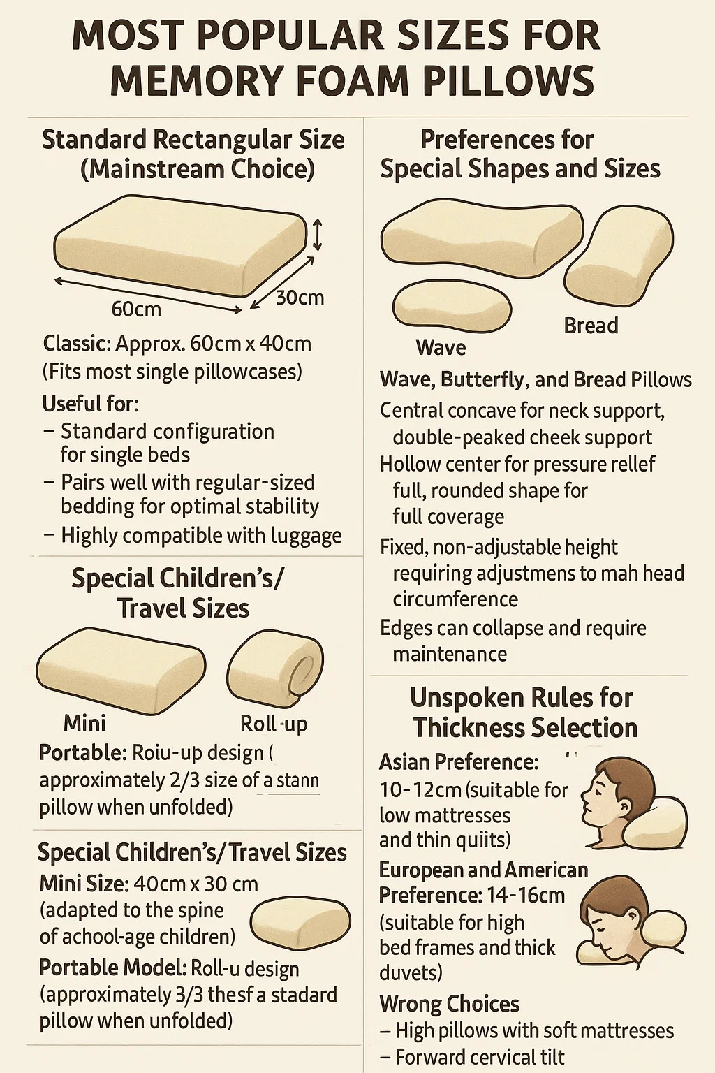 Pontos problemáticos ocultos: → Os travesseiros infantis precisam ser redimensionados a cada 5 anos (conforme sua altura aumenta) → Os travesseiros de viagem comprimidos por mais de 3 meses podem danificar sua elasticidade